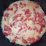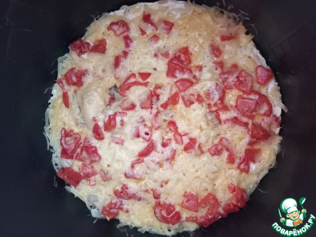 Теперь всё зальём приготовленной смесью. Не перемешиваем! Выкладываем поверх помидор и присыпаем сыром. Выставляем режим "Выпечка". Он у меня 50 минут. Мне понадобилось 40 минут для приготовления. Красивая и румяная запеканка готова. Без проблем и хлопот.