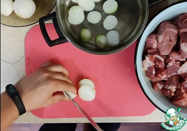 800 грамм репчатого лука режем кольцами в толщину около 1 см для насаживания на шампуры (по желанию)