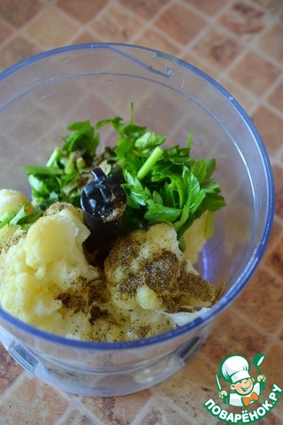 Цветную капусту отварить. Я готовила в пароварке в течение 25 минут. Дать остыть немного. В блендере измельчить приготовленную капусту, 3 нарезанные веточки петрушки и чёрный молотый перец.