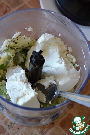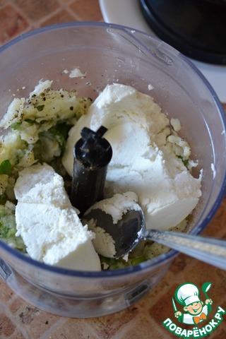 Добавить творог и измельчить массу в гладкое пюре.