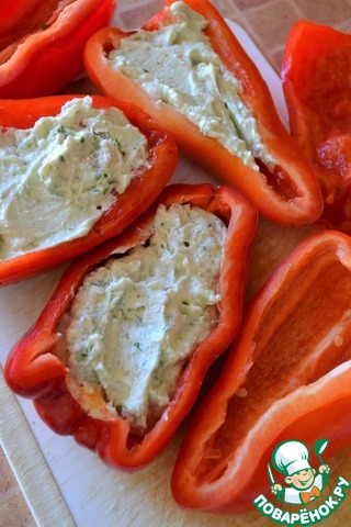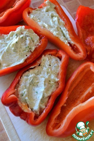 Перцы разрезать вдоль пополам, удалить плодоножку, перегородки и семена. Наполнить половинки перца творожной массой.