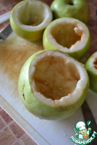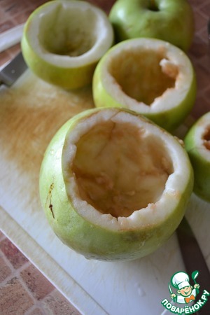 У яблок срезать верхушку, аккуратно удалить сердцевину при помощи ножа и чайной ложки. Сбрызнуть яблоки соком лимона. Сделать небольшой надрез поперёк каждого яблока.