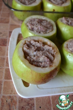 Наполнить яблоки фаршем и поместить в форму для выпечки. По желанию, добавить лавровый лист и палочки корицы в яблоки. Запечь при 180° в течение 40 минут.
