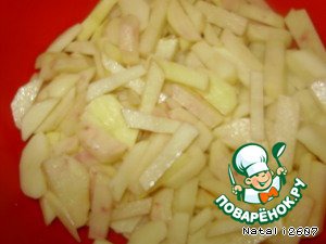• Тем временем картофель почистить, помыть и нарезать брусочками. Добавить в бульон к гороху.