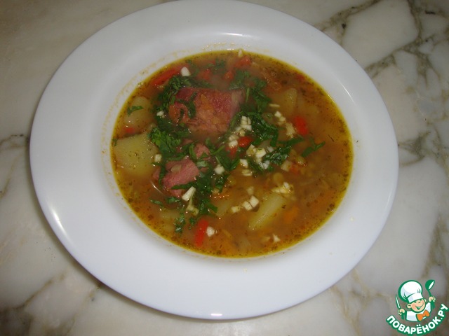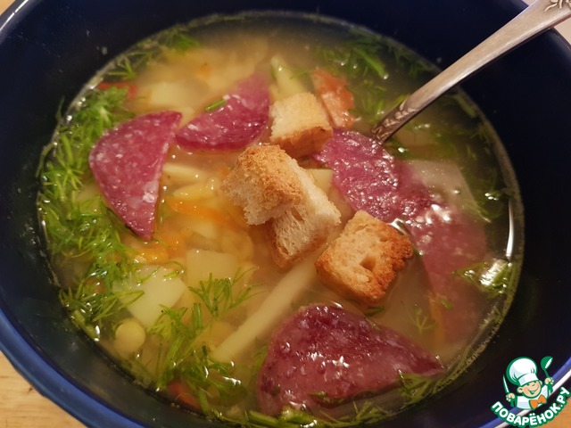 Рецепт «Гороховый суп с копченостями и крутонами»: