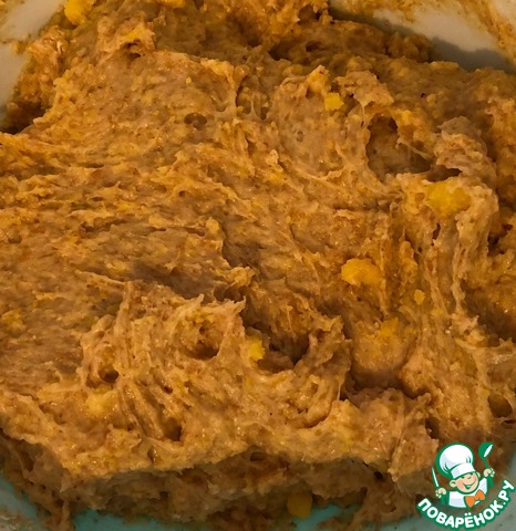 3. К немного остывшей поленте добавляем яйца. При желании можно посолить. Хорошо все перемешиваем и добавляем всю цельнозерновую муку и большую часть пшеничной муки.