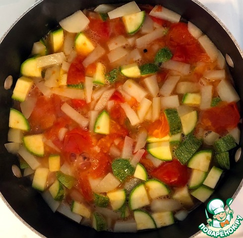 8. Добавляем кабачки и картофель к помидорам. Все хорошо перемешиваем и варим 15 минут (начиная считать с момента стабильного кипения).