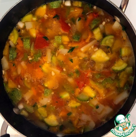 11. Продолжаем варить овощи еще 10 минут, добавив сельдерей, кориандр, тимьян, орегано, имбирь, часть зелени и чеснока. Все хорошо перемешиваем и добавляем соль по вкусу. -