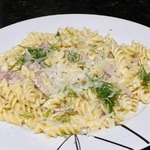 Carbonara is an Italian pasta dish from Rome made with eggs, hard cheese, cured pork, and black pepper. The dish arrived at its modern form, with its current name, in the middle of the 20th century. The cheese is usually Pecorino Romano, Parmigiano-Reggiano.