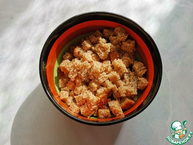 Добавить хлебные кубики и оливковое масло.