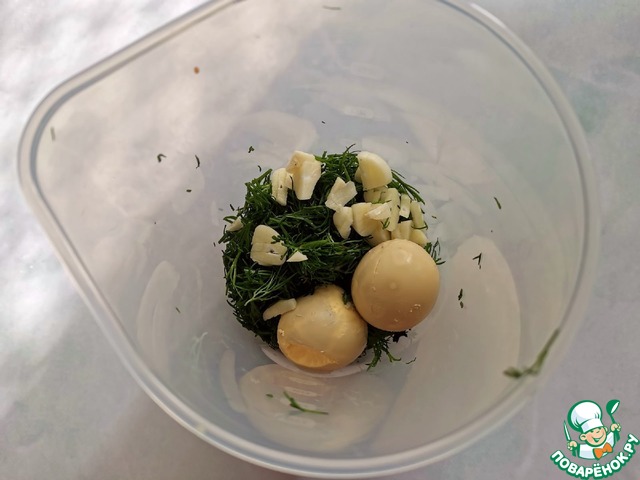 Сварить и остудить яйца. Отделить желтки. Нарезать укроп и зубчики чеснока.