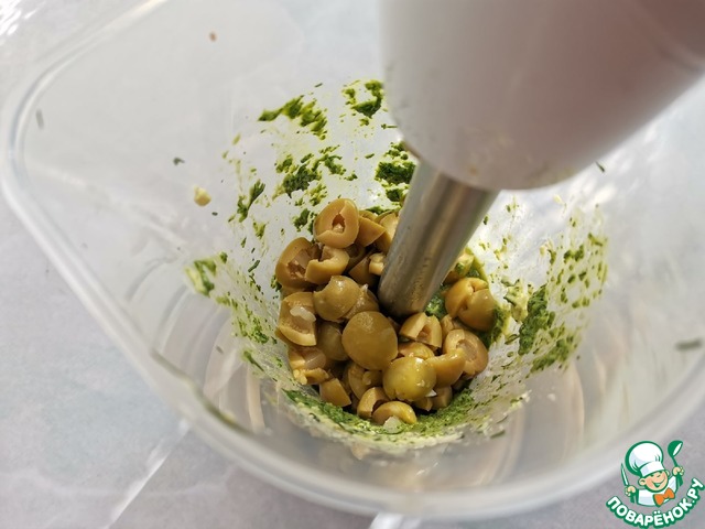 Всыпать оливки и снова измельчить.