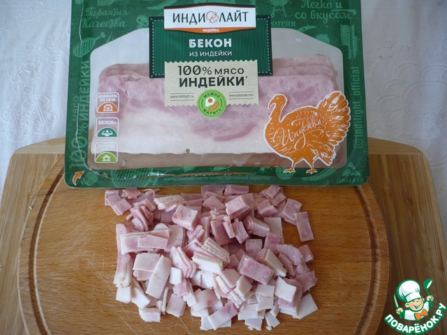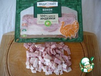Берем бекон из индейки ТМ "ИНДИЛАЙТ"и мелко его нарезаем. |