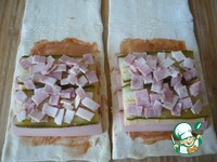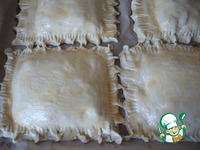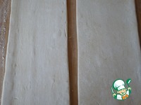 Для приготовления слоеных конвертиков с начинкой берем предварительно размороженное слоеное тесто и разрезаем на две одинаковых части. |