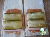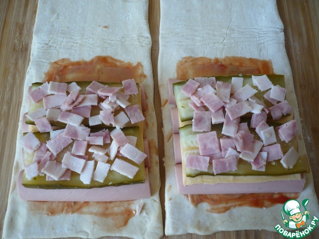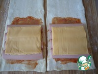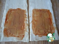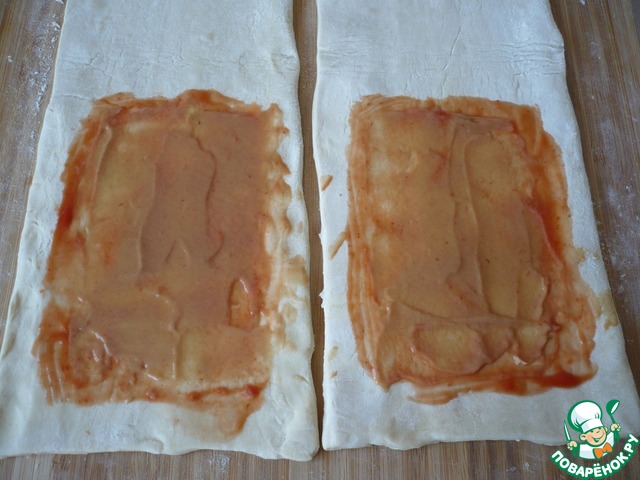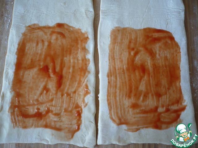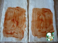 Затем половину каждого пласта теста хорошо промазать кетчупом. |
