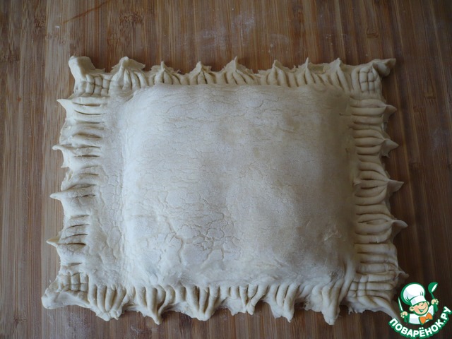 Затем свободным краем теста закрываем конвертик и хорошо защипываем края удобным для вас способом. |