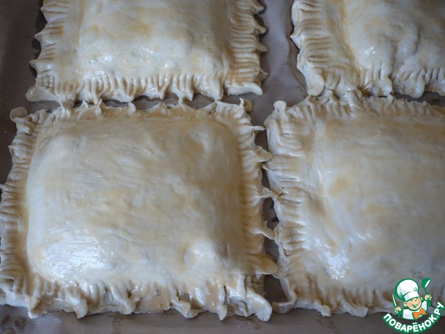 Готовые конвертики выкладываем на противень застеленный пергаментной бумагой. Конвертики смазываем взбитым яйцом и ставим в духовку при температуре 180 градусов, на 20-25 минут. |