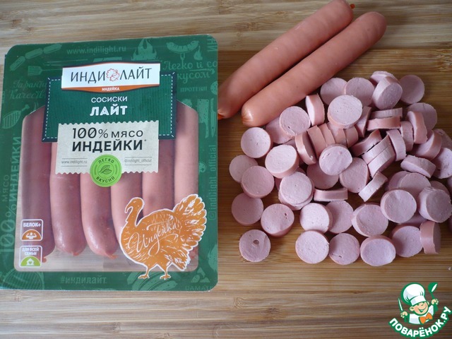 Для приготовления закуски я взяла сосиски лайт из мяса индейки ТМ "ИНДТЛАЙТ". Каждую сосиску нарезаем небольшими кружочками, на равные части.