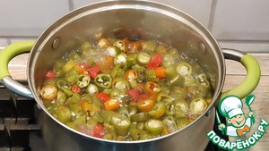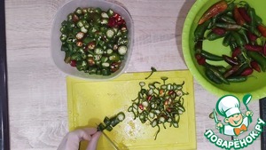 1 килограмм перцев халапеньо режем на колечки по 1 сантиметру, удаляем плодоножки и места их крепления. Лучше все делать в перчатках.