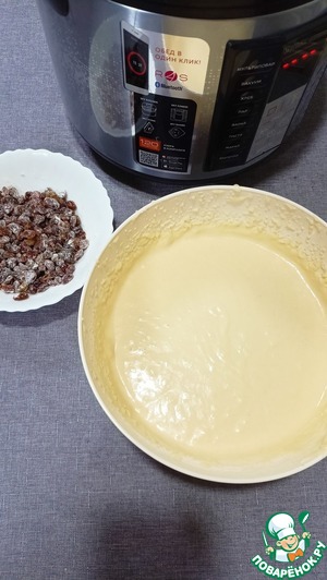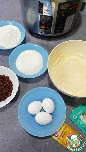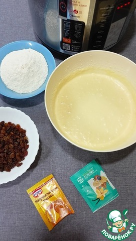 Продолжаем готовить тесто: добавляем муку, разрыхлитель и ванилин — до однородного состояния. Взбиваем все это миксером 1-2 минут. Так же извалять изюм в муку (1 чл).
