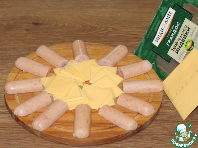 7. Каждую сосиску и пластину сыра разрезаем на 4 части. Получается 12 порций.