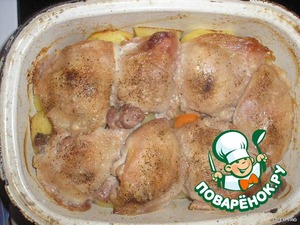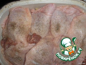 Поверх гарнира разложите курочку в один ряд кожей кверху (можно взять и свинину, но с жирком). Посыпьте сверху вашими любимыми приправами. Желательно, чтобы все лежало плотно и полностью закрывало наш гарнир.