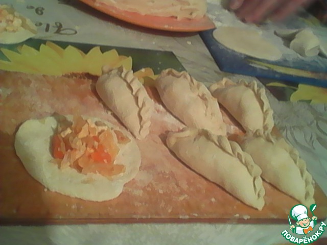 Теперь перейдем к созданию наших пирожков, добавляя в начинку как капусту, так и филе индейки. Аккуратно закрепляя фигурно края пирожков, чтобы начинка «не убежала» при жарке.