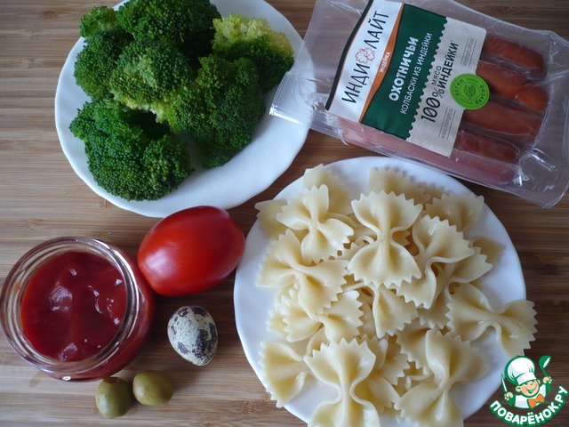 Для приготовления "Забавного" завтрака для школьников приготовьте следующие продукты: макаронные изделия "Фарфалле" сварите согласно инструкции на упаковке, соцветия брокколе, отварите в кипящей воде на среднем огне 2-3 минуты, отварите перепелиное яйцо, также подготовьте две охотничьи колбаски из индейки ТМ "ИНДИЛАЙТ", маслину или оливку, кетчуп и помидор.