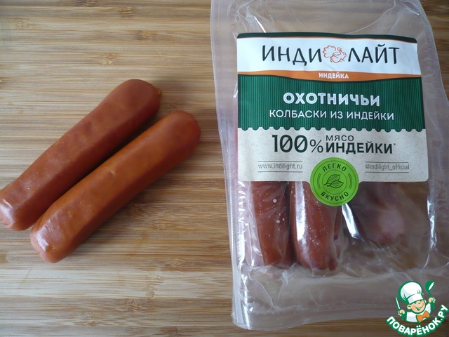 Для приготовления завтрака для школьника я взяла две охотничьи колбаски из индейки ТМ "ИНДИЛАЙТ".