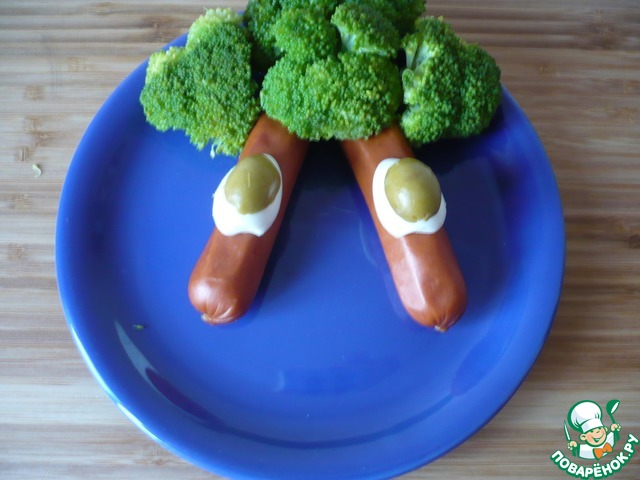 Начинаем оформлять завтрак для школьника: на тарелку положите две охотничьи колбаски из индейки, сверху уложите отваренную брокколе (имитация "волос"). На колбасках сделайте глаза из разрезанного пополам перепелиного яйца и разрезанной пополам маслины или оливки.