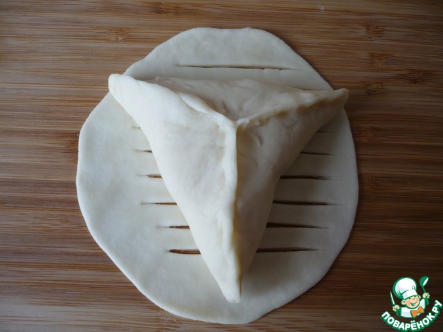 Затем берем маленький кусочек теста и раскатываем его в тонкую лепешку, чтобы она получилась по размеру больше приготовленной булочки -"треугольника". В середине лепешки сделайте надрезы с помощью ножа.