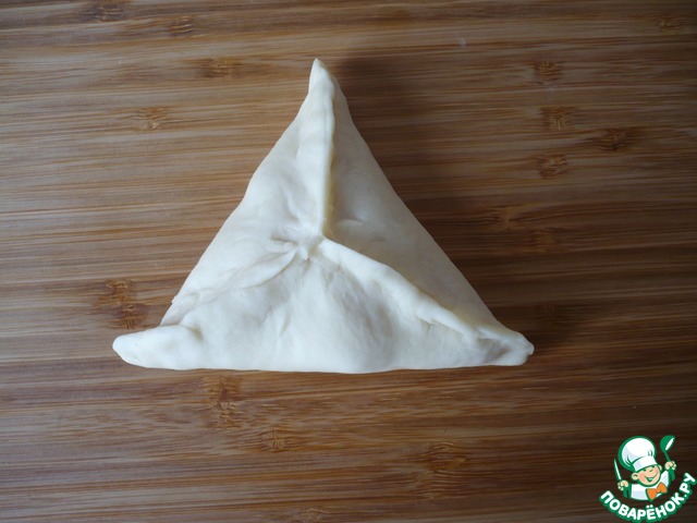 Начинаем формировать булочки. Приподнять с трех сторон края теста и защипнуть их так, чтобы получился треугольник.