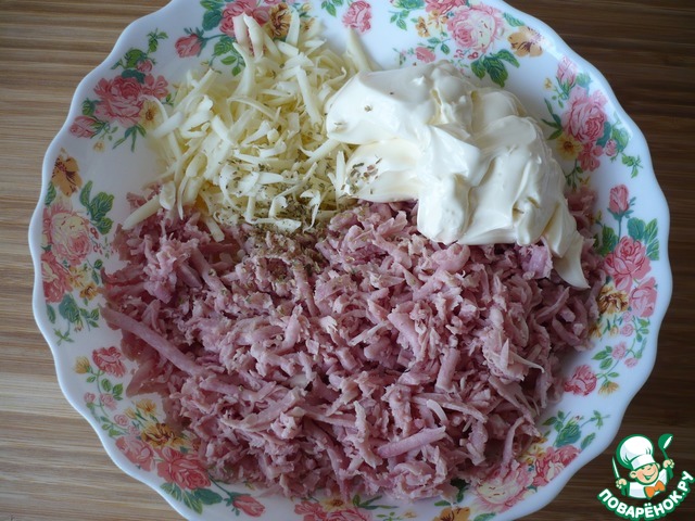 Выложите в миску натертую ветчину, добавьте сливочный сыр и натертую на крупной терке моцареллу, посыпьте орегано.