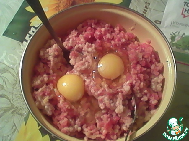 • В полученный фарш добавляем 2 куриных яйца, специи и соль по вкусу. Перемешиваем фарш.