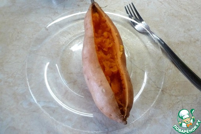 Батат готов. Разрезать его вдоль ножом и разрыхлить мякоть вилкой.