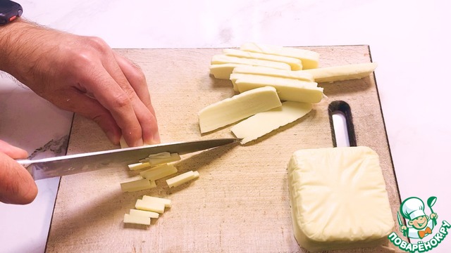 Затем сыр мелко нарезаем (или можете натереть его на крупной терке).