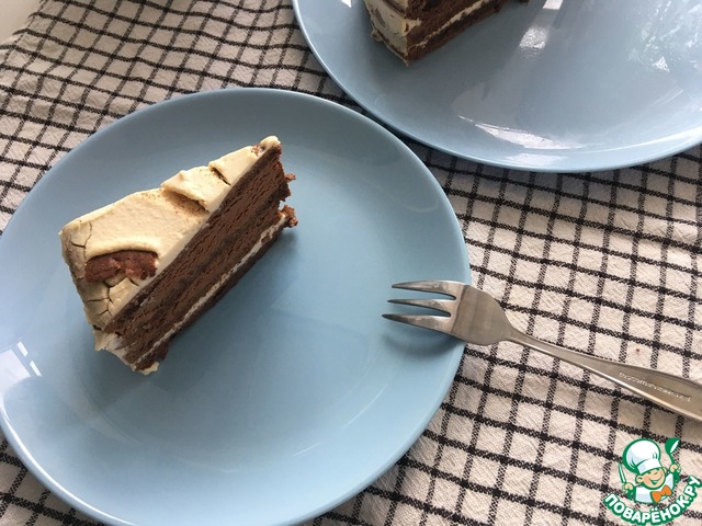 Собираем торт: корж-крем-корж-крем. Для прослойки используем шоколадный крем, а бока и верх торта покрываем светлым кремом, украшаем по желанию.