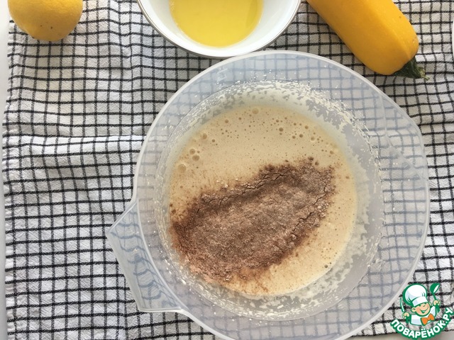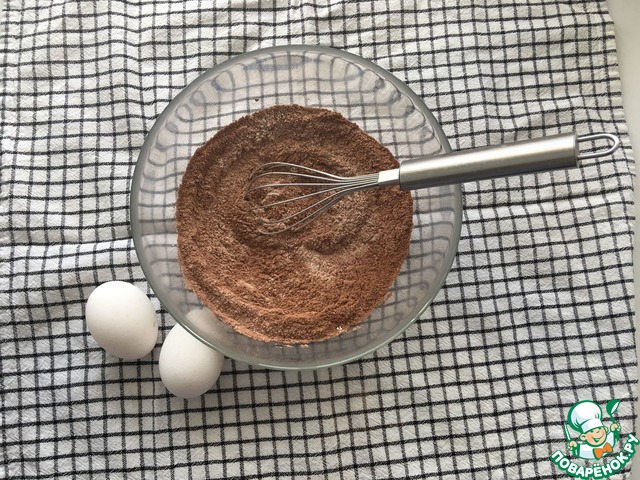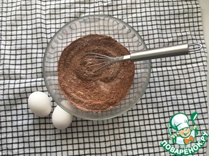 Смешать сухие ингредиенты (оба вида муки, соду, какао-порошок). Если нет рисовой муки, то добавьте только пшеничную, но 110 г.