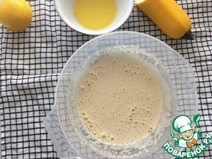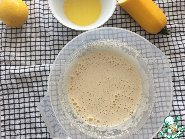 Яйца взбить с сахаром до пышной светлой массы, добавить хорошо отжатый кабачок.