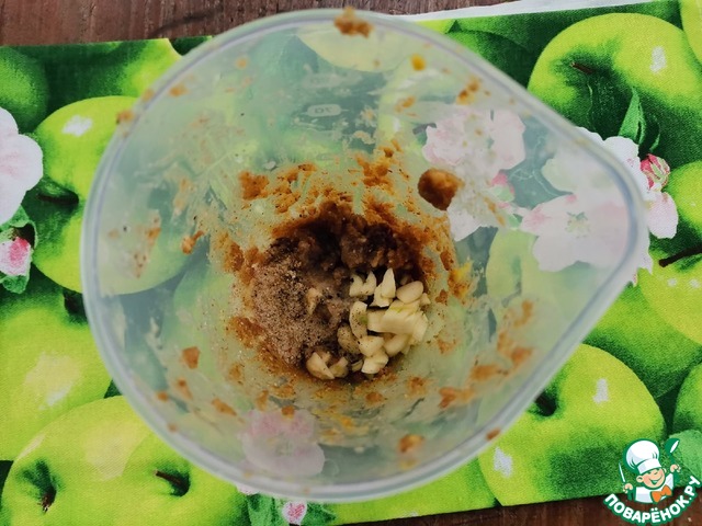 • Добавить к орехам горчицу, уксус, растительное масло и измельчить блендером.