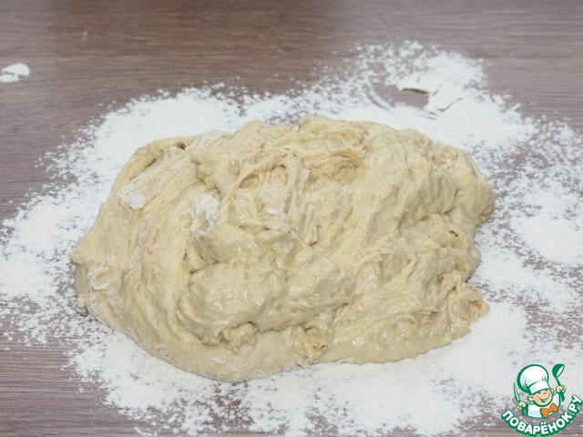 6... выкладываем его на подпыленную мукой столешницу. Вымешиваем тесто, минут 10 и собираем в ком, округляем.