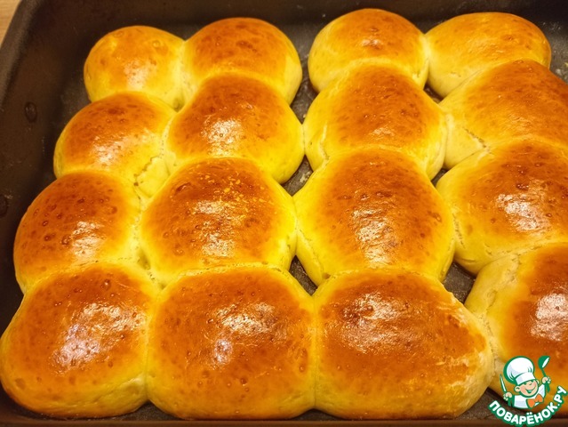 4. Колобки перекладываем на противень, застеленный пергаментом, смазываем слегка взбитым яйцом и ставим выпекаться в разогретую до 180 ℃ духовку на 25-30 минут (до красивой румяности). Готовые булочки по желанию посыпаем сахарной пудрой.