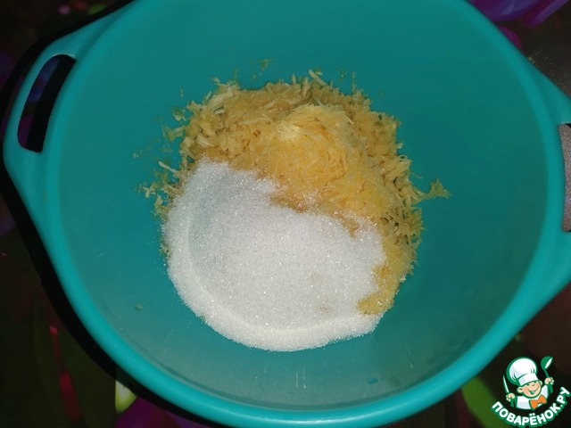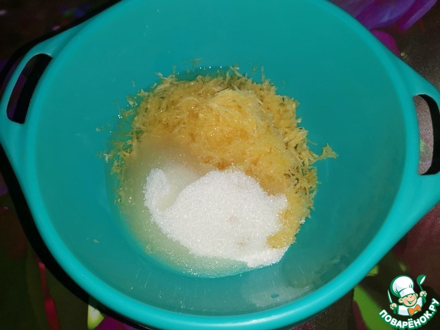 К тыкве всыпать сахар, перемешать и дать постоять минут 10.