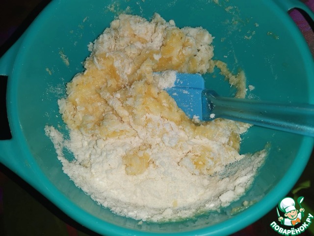 Просеять рисовую муку и разрыхлитель, добавить кокосовую стружку.