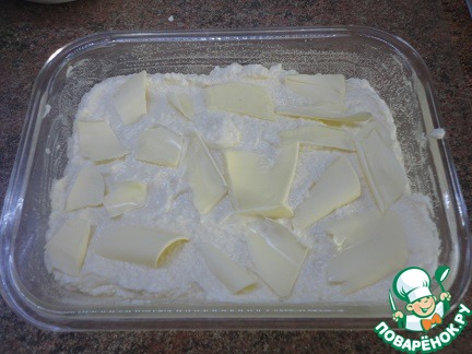 Все выложить на яблоки. По верху творожной массы распределить кусочки холодного сливочного масла.