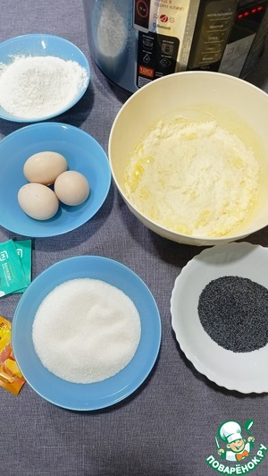 • Продолжаем готовить тесто: добавляем муку, мак, разрыхлитель и ванилин — до однородного состояния. Взбиваем все это миксером 1-2 минут.