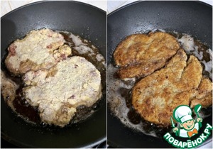 Тщательно обваляв в панировочных сухарях ломти мяса выложили на сковороду.
