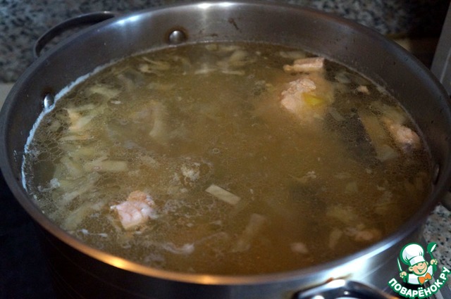 • Из готового бульона вынуть кости, бульон процедить в другую кастрюлю. Бульон довести до кипения, поместить туда картошку, дать закипеть, убавить температуру до средней и варить 12 минут.