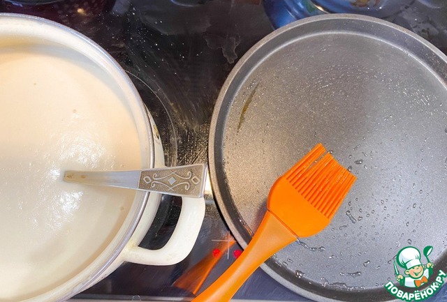 Приступаем к выпеканию блинов. Сковородку нужно разогреть заранее, чтобы она была сильно нагрета. Смазываем подсолнечным маслом и берем большой половник. Начинаем выливать тесто с середины сковородки, аккуратно покручивая ее за ручку, чтобы блин распределился по все поверхности.