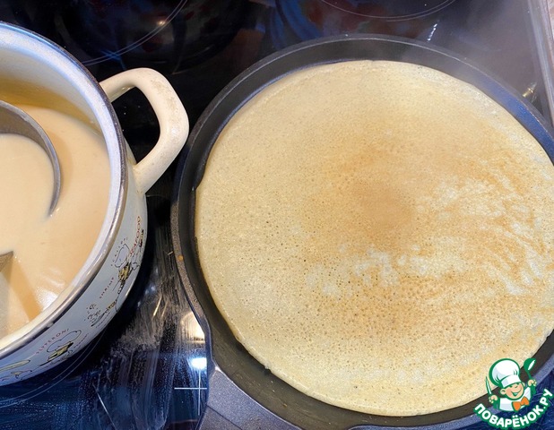 Тесто и не должно быть густое) Как раз тягучее, но плотное. Если будет сильно густое, тонкие блинчики не получаться, это уже будут очень толстые блины. А если через чур жидкое тесто, тогда блин выйдет слишком тонким или вообще комом, при попытке перевернуть.